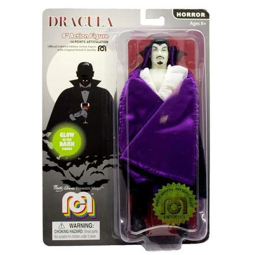 Hailing from Transylvania, Count Dracula is a vampire, 500 years old, with supernatural powers and weaknesses. He can bite people and turn them into vampires. This figure comes with detailed blood droplets on his fangs.Glow In The Dark!