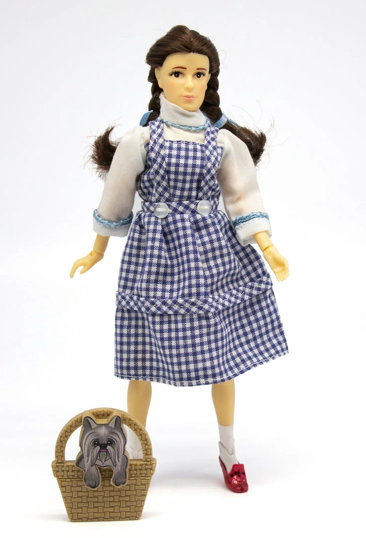 Dorothy lands in the magical place known as Oz after a tornado spirits her from her home in Kansas. In her search for a way to return home, Dorothy befriends others looking to meet the reclusive Wizard to help them with their troubles. This Mego is wearing her iconic ruby slippers, plaid dress, styled pigtails, and, of course, carrying a basket with Toto.