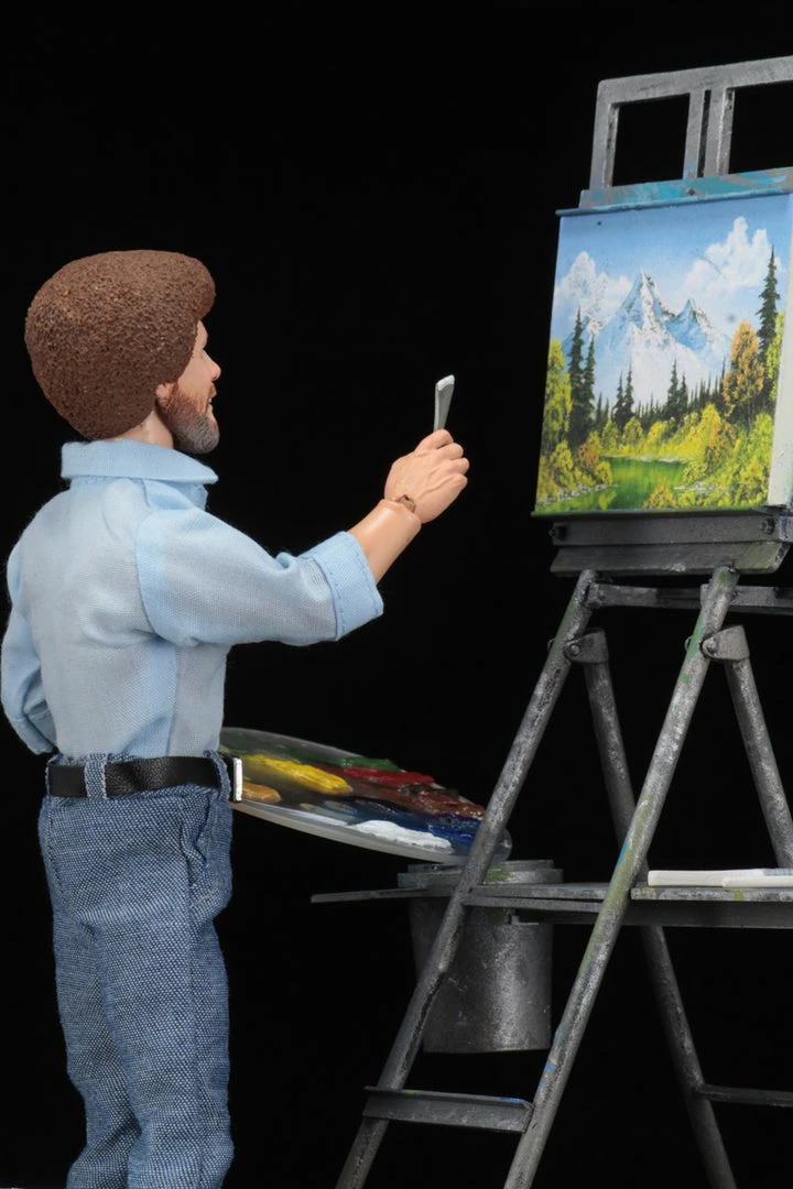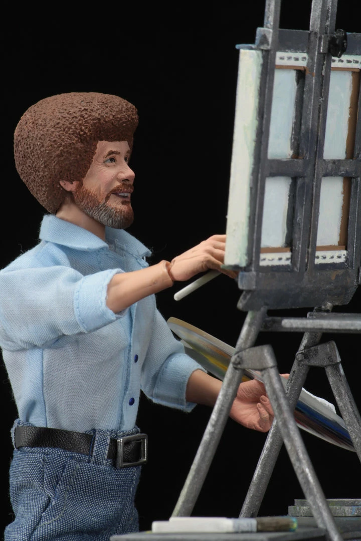 Standing at 8” tall and fully articulated, Bob Ross wears his signature look from The Joy of Painting and will create a happy little space on your shelf. He comes with a paint palette, 2 brushes, a palette knife, and a large easel display.