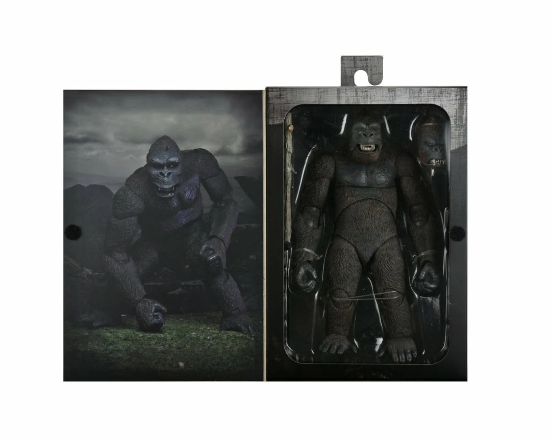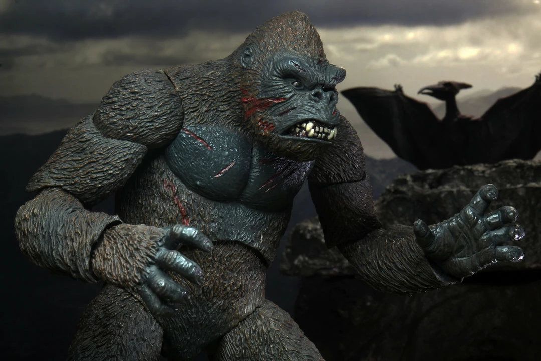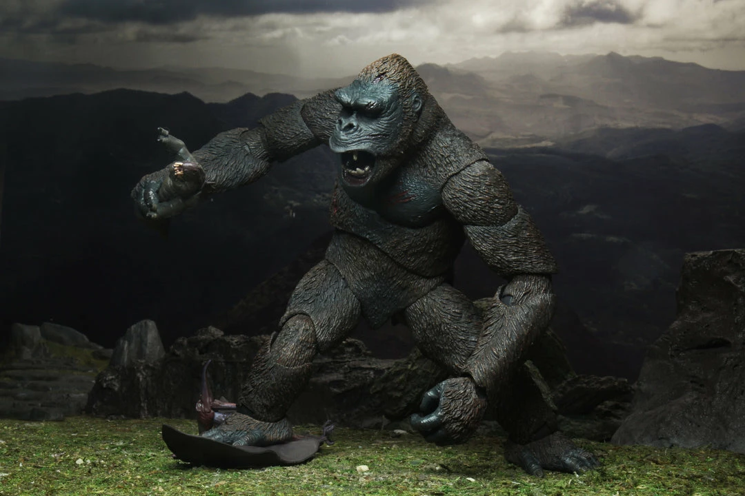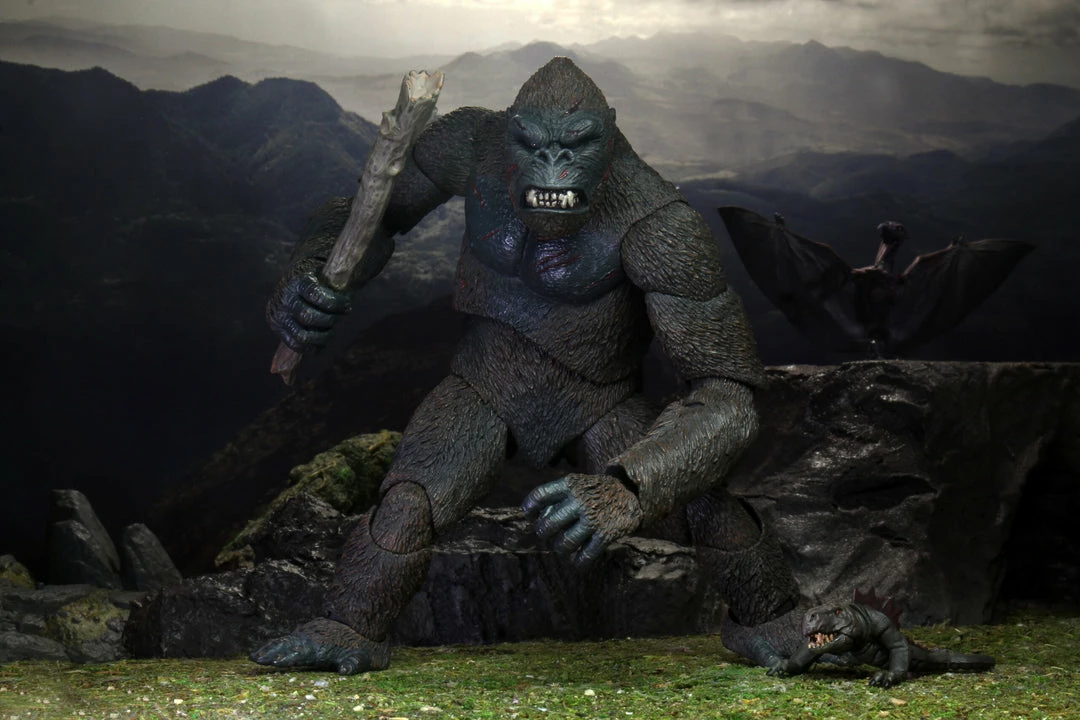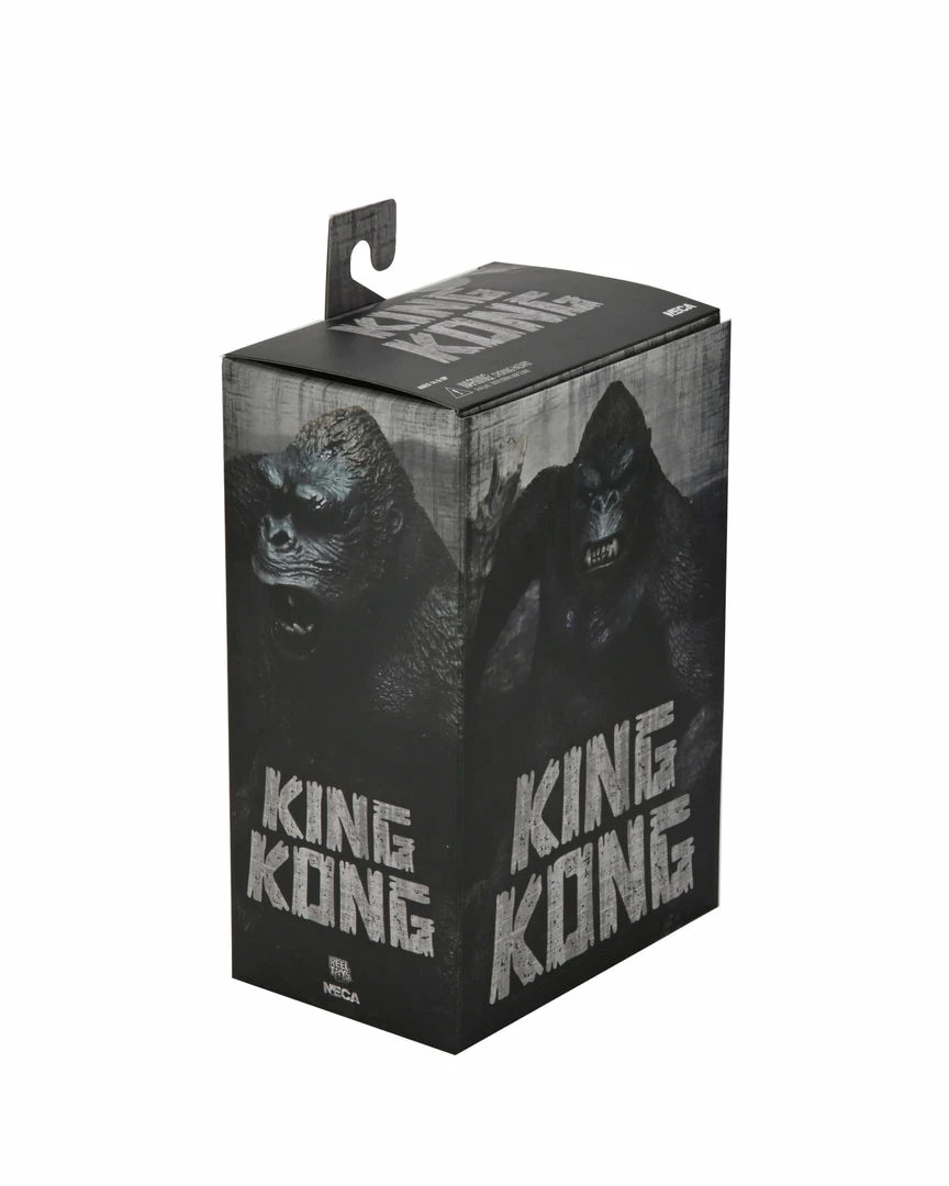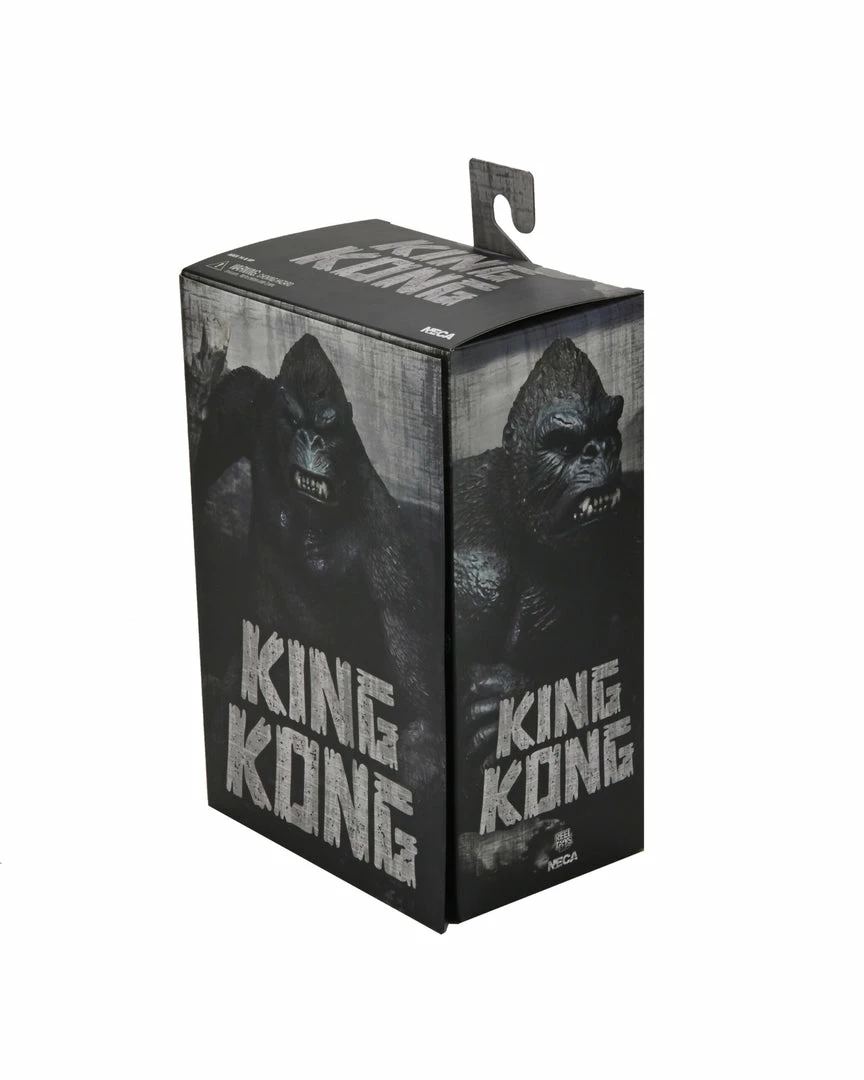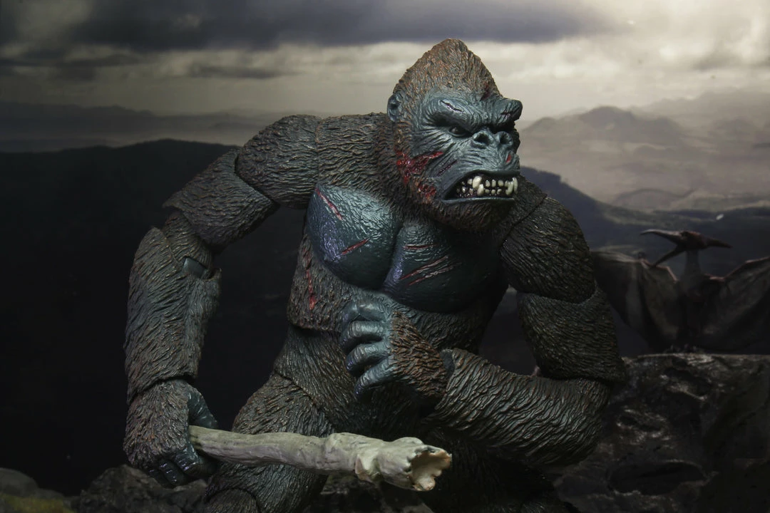 NECA proudly presents the Ultimate King Kong! He stands 8″ tall with super detailed hair and battle wounds across the body and head sculpts, received from defending his island. This massive figure has over 30 points of articulation. The figure includes two brand-new interchangeable heads (one with jaw articulation), 3 pairs of interchangeable hands, a pit monster, pteranodon, and tree trunk accessory. Display-friendly window box packaging with opening front flap.