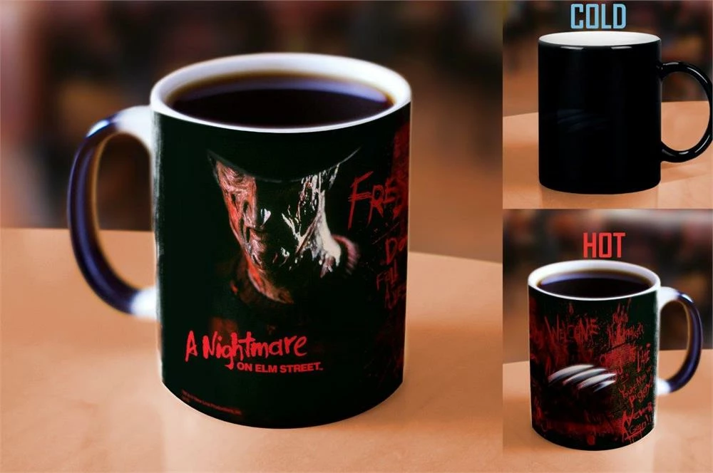 Keep yourself awake, and out of the realm of Freddy Krueger, with this Morphing Mugs heat-sensitive mug. This collectible mug features an officially licensed image collage of Freddy. The exterior of this mug transforms from black as hot liquid is added, revealing the hidden image in full vivid colors.