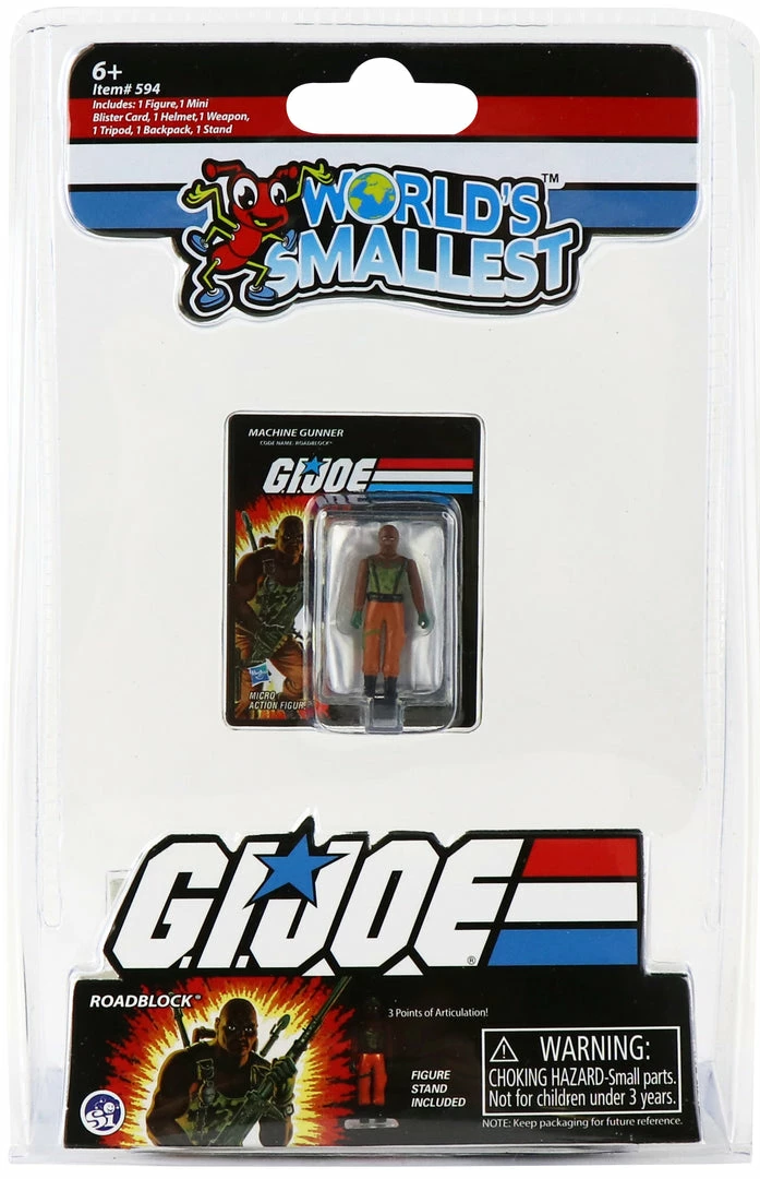 Now available in the world’s smallest size ever, measuring only 1.25 inches tall, each Micro Action Figure has three points of articulation, and includes a replica of the original action figure blister card, for display and storage, display stand and accessories. Collect all three original, retro styles – Duke, RoadBlock and Snake Eyes.