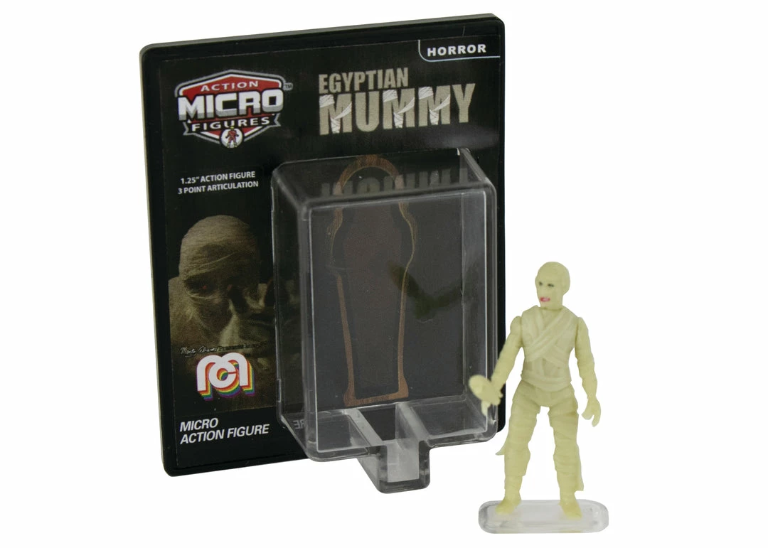 Measuring only 1.25 inches tall, each Micro Action Figure has three points of articulation, and includes a replica of the original action figure blister card, for display and storage and display stand. Collect all three MEGO Series 2 monsters Egyptian Mummy, The Fly and Headless Horseman!